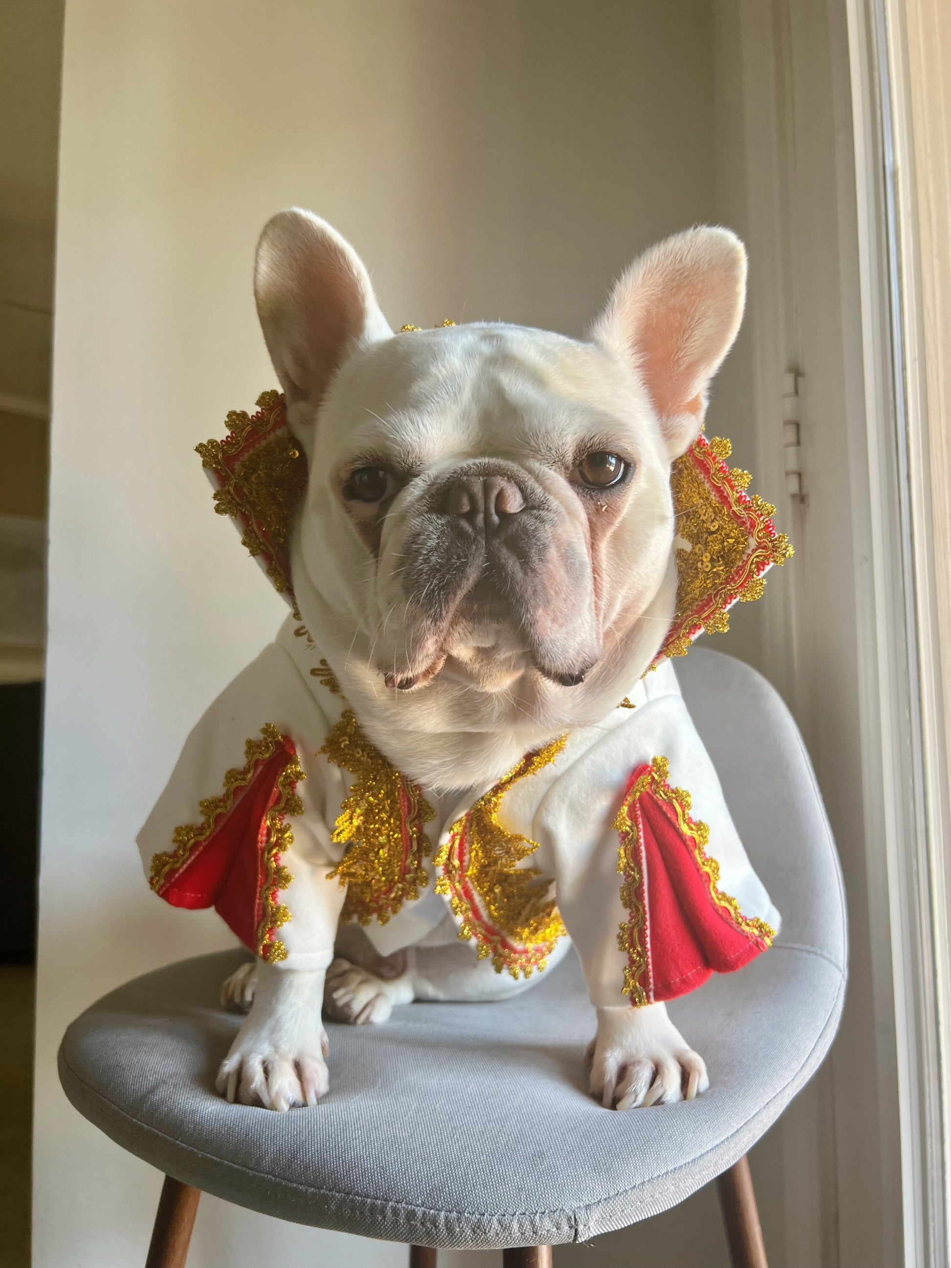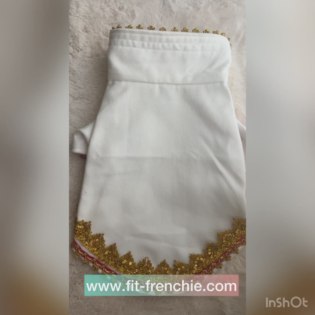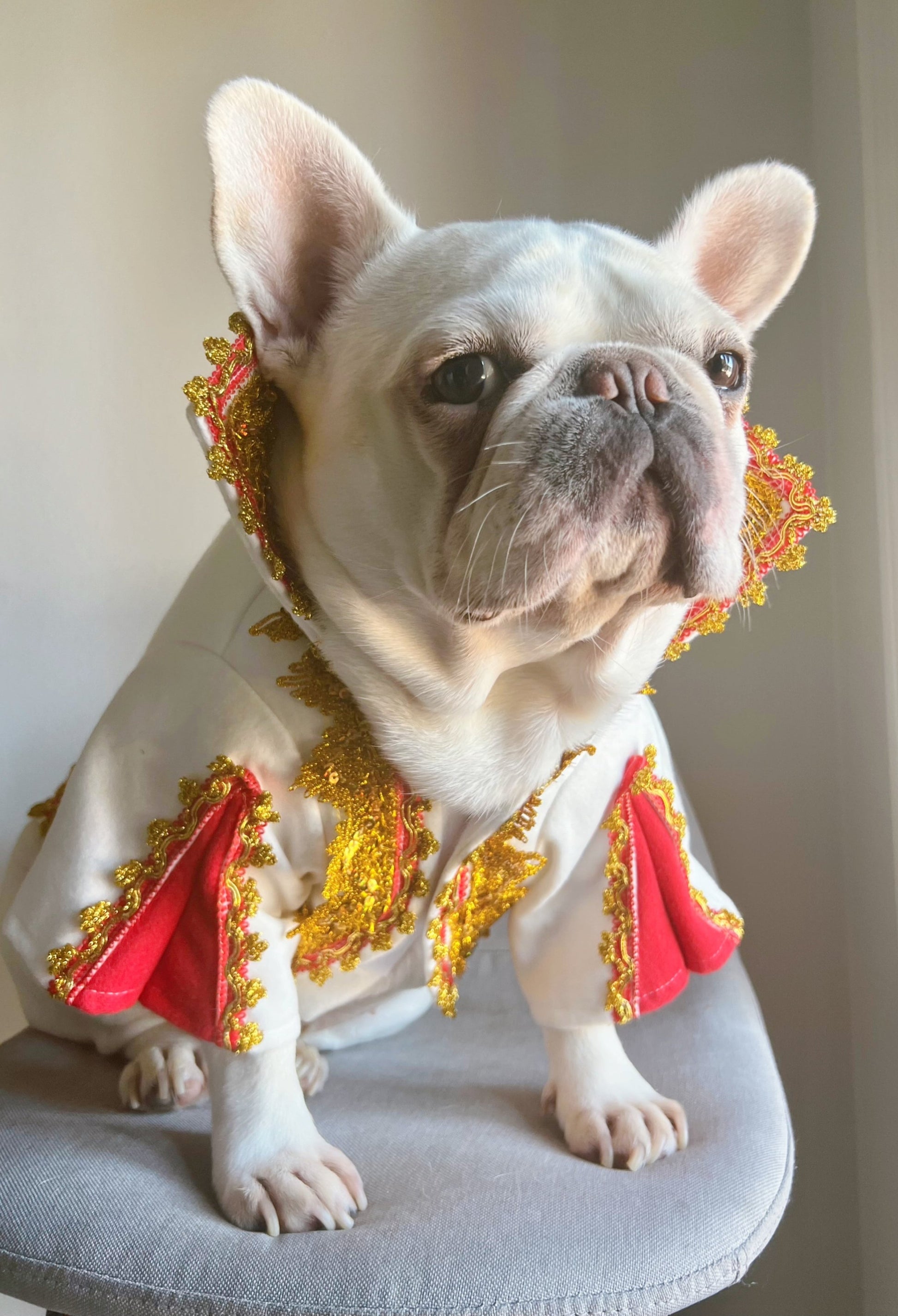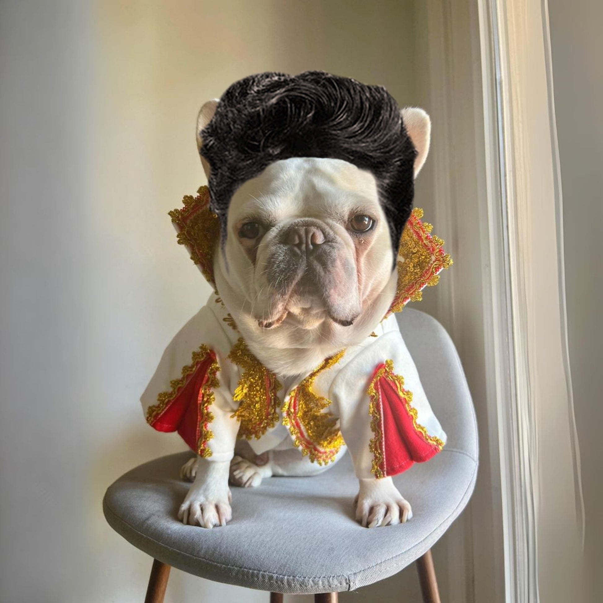 Let your furry friend channel their inner rock star with this Elvis Presley-inspired dog costume! Designed for pups with a flair for the dramatic, this costume features a classic white coat adorned with gold trim and red accents, reminiscent of the iconic stage outfits worn by the King of Rock 'n' Roll himself. The high collar and intricate detailing add an authentic touch, making your dog the star of any party or event.